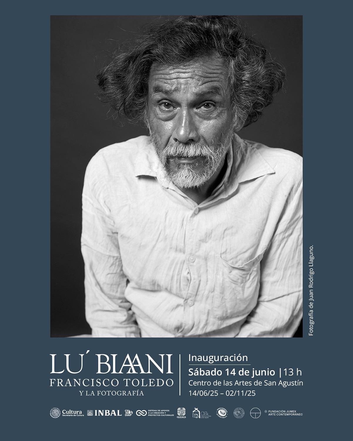 Lu’ Biaani: Francisco Toledo y la fotografía, se presenta en el Centro de las Artes de San Agustín (CaSa). La muestra, curada por el investigador Alejandro Castellanos, se da en un trabajo colaborativo con el Centro Fotográfico Manuel Álvarez Bravo (CFMAB), Amigos del IAGO y del CFMAB A.C. y Francisco Toledo A.C.