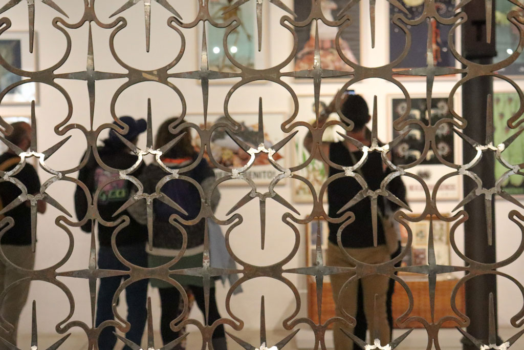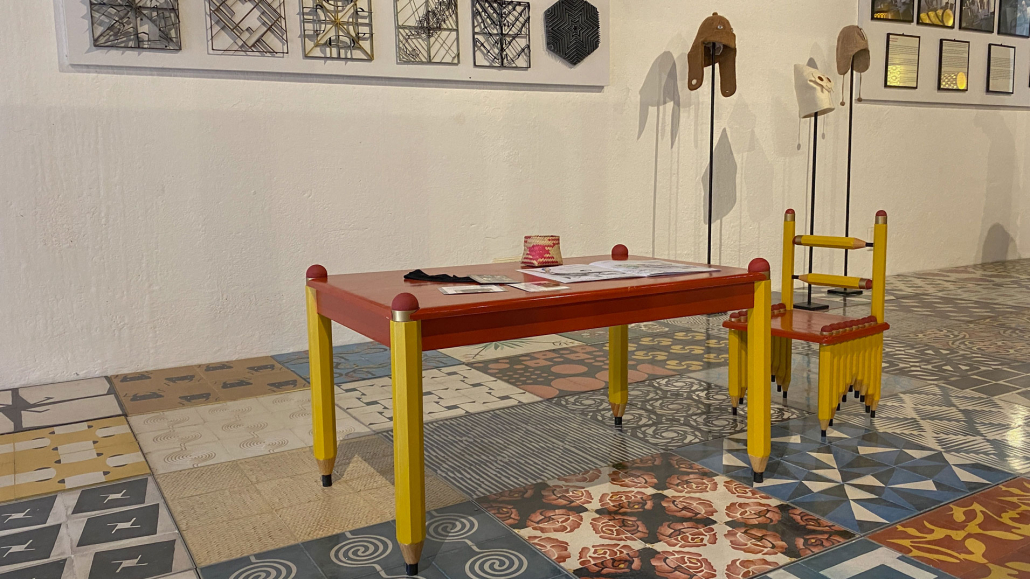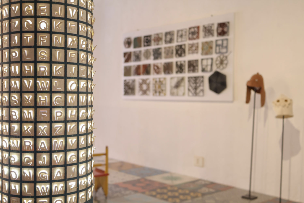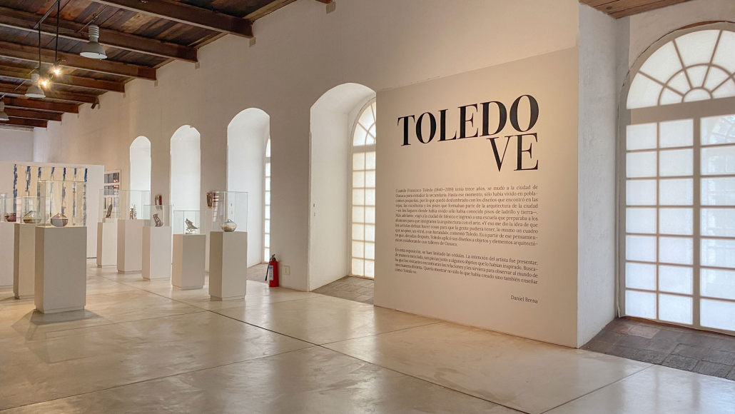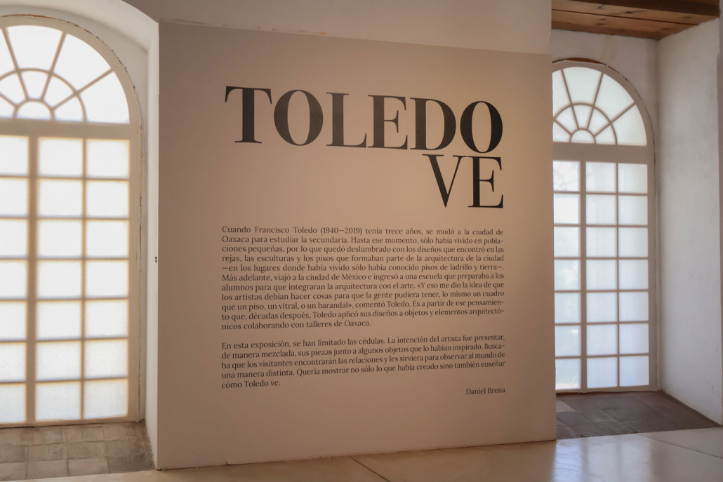 Cuando Francisco Toledo (1940—2019) tenía trece años, se mudó a la ciudad de Oaxaca para estudiar la secundaria. Hasta ese momento, sólo había vivido en poblaciones pequeñas, por lo que quedó deslumbrado con los diseños que encontró en las rejas, las esculturas y los pisos que formaban parte de la arquitectura de la ciudad —en los lugares donde había vivido sólo había conocido pisos de ladrillo y tierra—. Más adelante, viajó a la ciudad de México e ingresó a una escuela que preparaba a los alumnos para que integraran la arquitectura con el arte. «Y eso me dio la idea de que los artistas debían hacer cosas para que la gente pudiera tener, lo mismo un cuadro que un piso, un vitral, o un barandal», comentó Toledo. Es a partir de ese pensamiento que, décadas después, Toledo aplicó sus diseños a objetos y elementos arquitectónicos colaborando con talleres de Oaxaca. En esta exposición, se han limitado las cédulas. La intención del artista fue presentar, de manera mezclada, sus piezas junto a algunos objetos que lo habían inspirado. Buscaba que los visitantes encontrarán las relaciones y les sirviera para observar al mundo de una manera distinta. Quería mostrar no sólo lo que había creado sino también enseñar cómo Toledo ve.