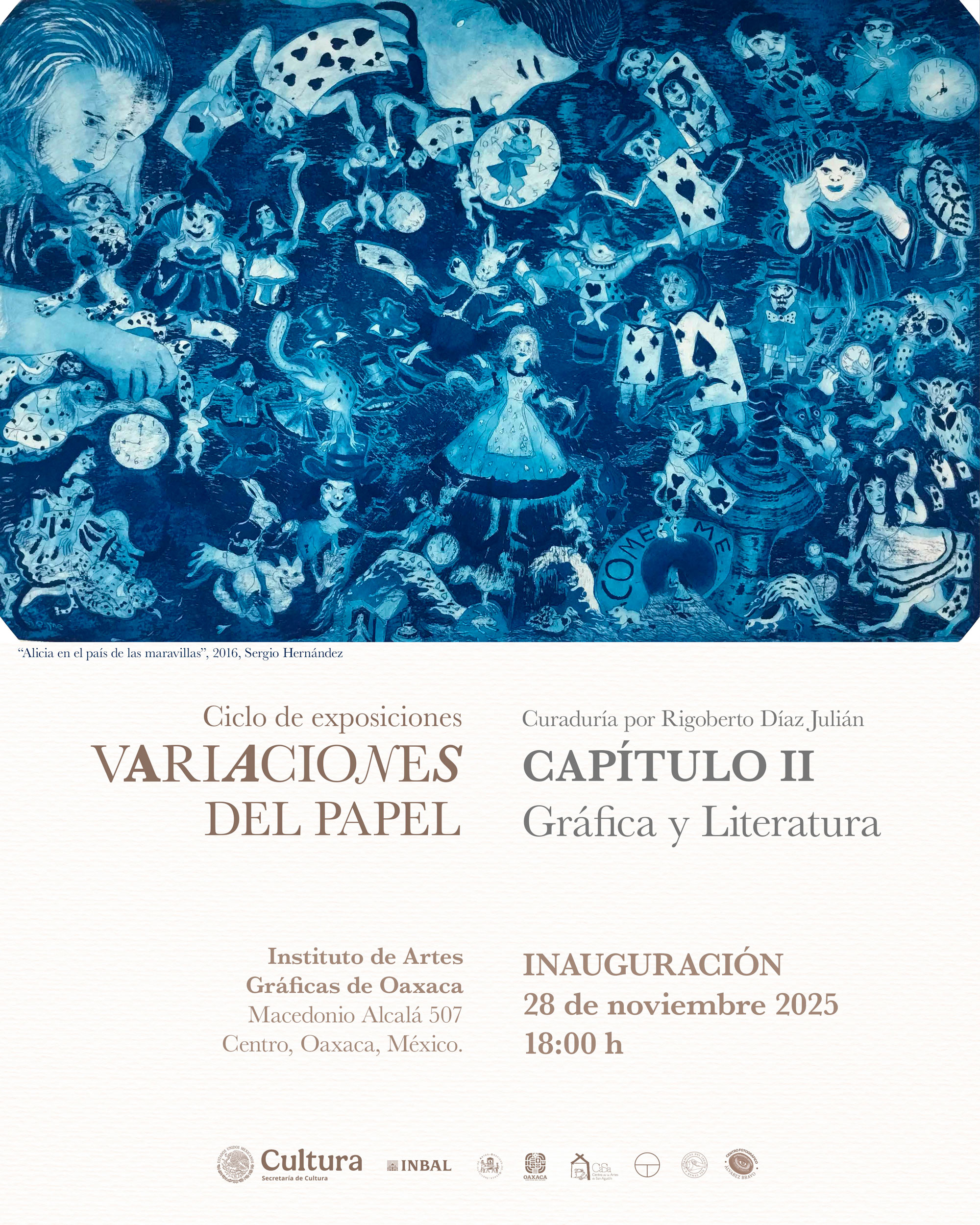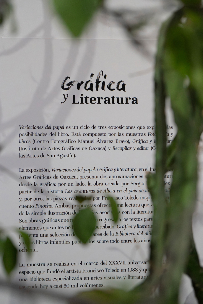 La exposición, Variaciones del papel. Gráfica y literatura, en el Instituto de Artes Gráficas de Oaxaca, presenta dos aproximaciones a la literatura desde la gráfica: por un lado, la obra creada por Sergio Hernández a partir de la historia Las aventuras de Alicia en el país de las maravillas y, por otro, las piezas realizadas por Francisco Toledo inspiradas en su interpretación del cuento Pinocho. Ambas propuestas ofrecen una lectura que va más allá de la simple ilustración de historias asociadas con la literatura infantil. Son obras gráficas que nos invitan a regresar a los textos para descubrir elementos que antes no habíamos percibido. Gráfica y literatura también presenta una selección de ejemplares de la Biblioteca del niño Mexicano y otros libros infantiles publicados sobre todo entre los años cuarenta y ochenta.